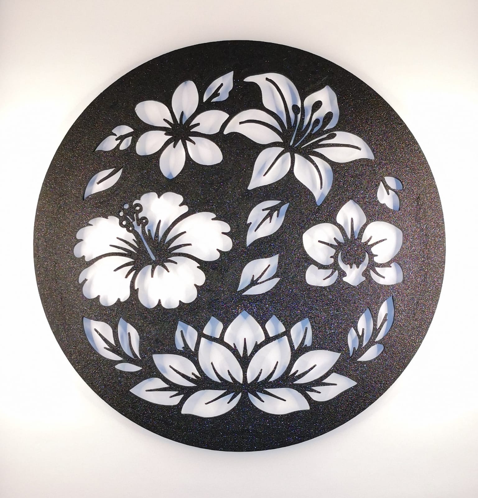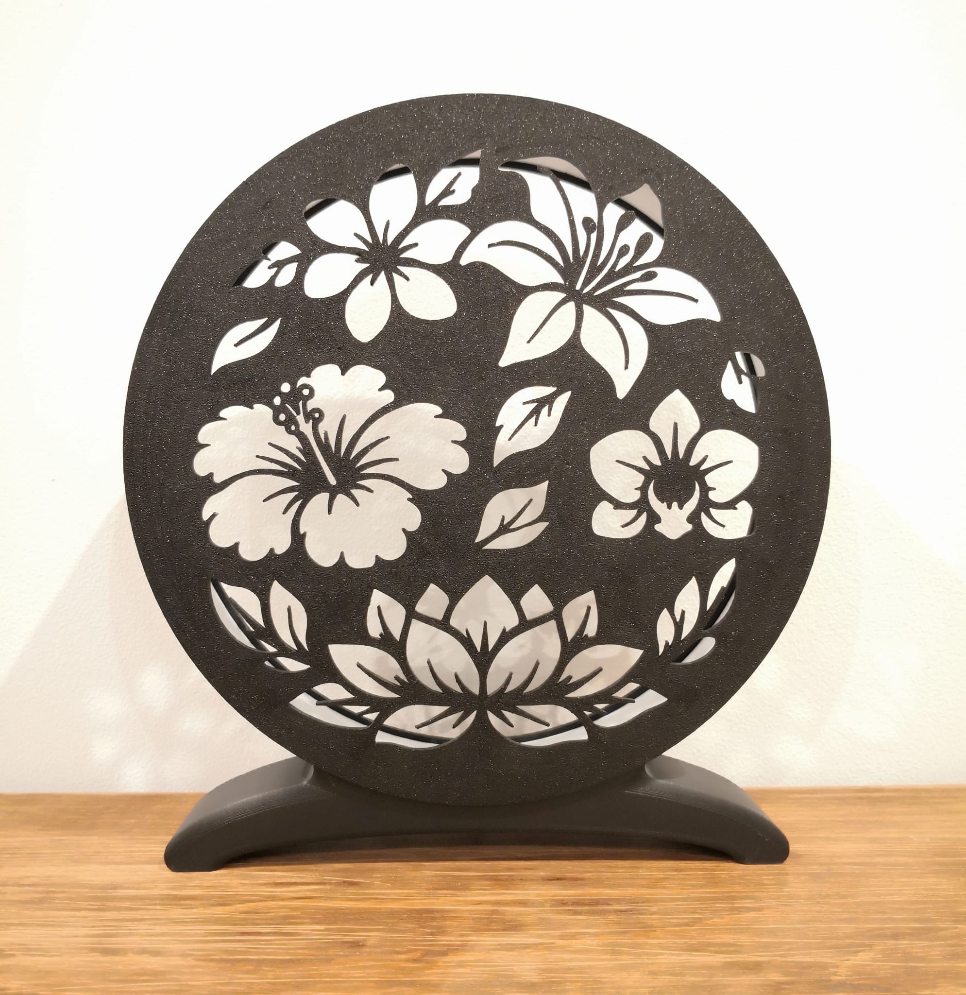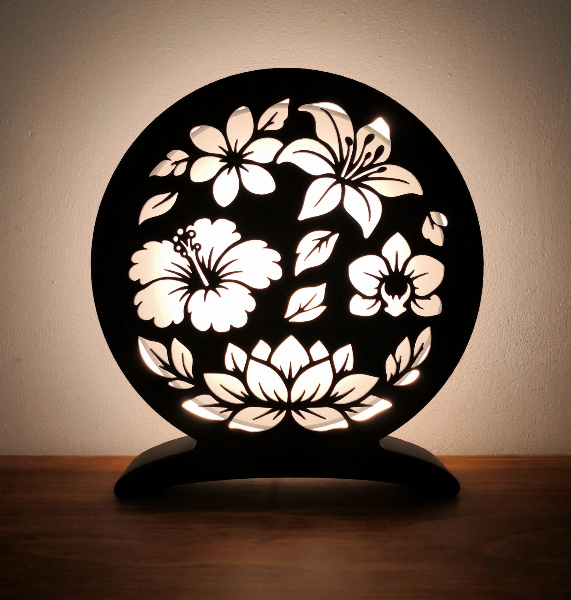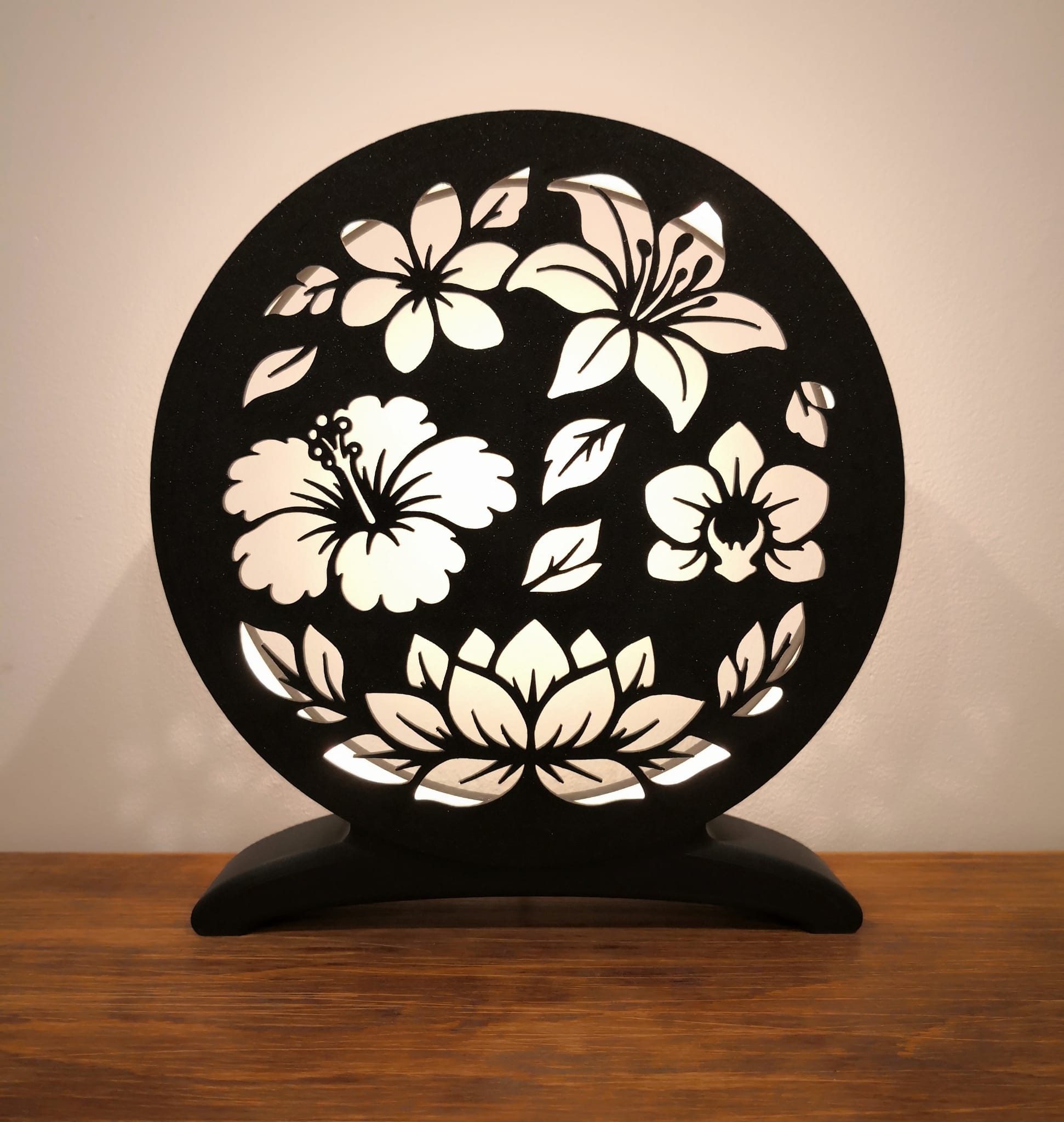 Cette lampe met en valeur une composition florale élégante composée de différentes fleurs et feuillages, dont un lotus central symbolisant l’harmonie et la sérénité. L’agencement circulaire apporte un équilibre visuel apaisant, idéal pour créer une atmosphère zen.