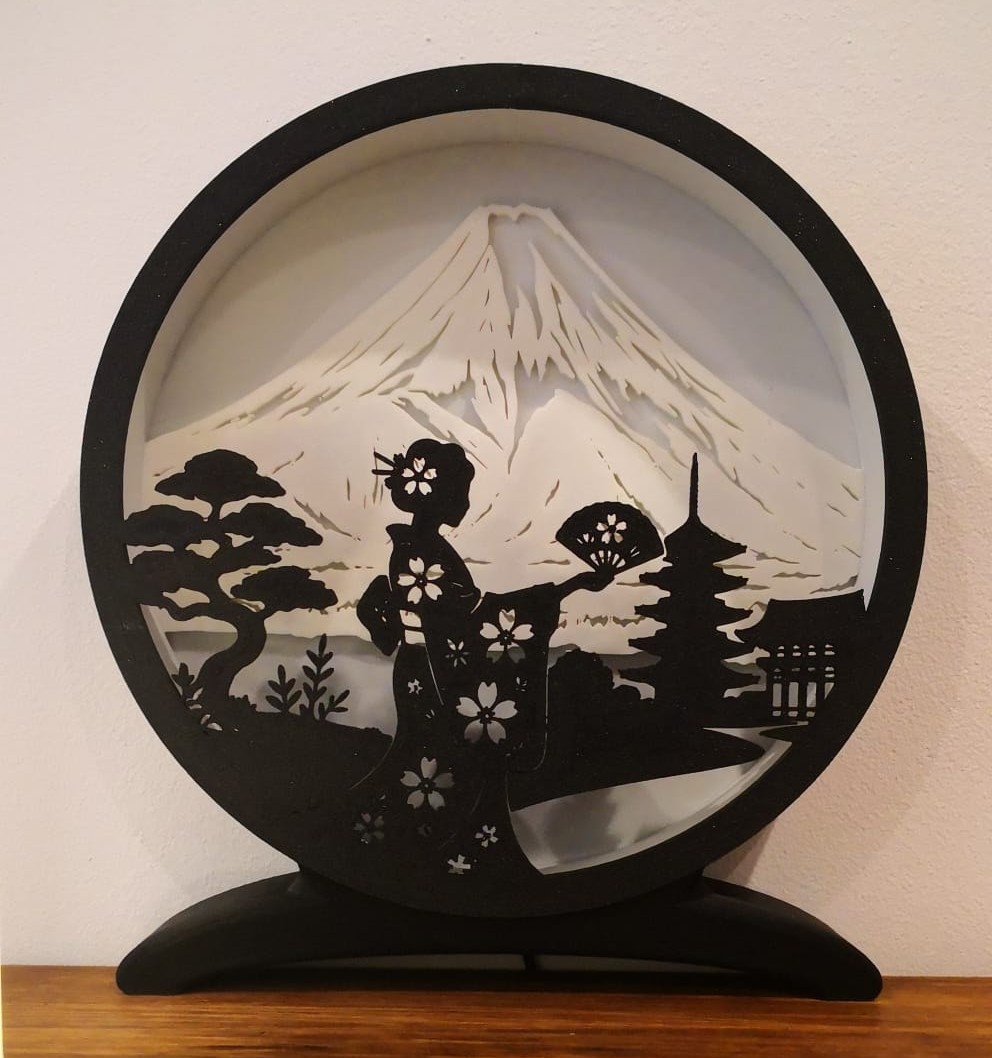 Inspirée de l’esthétique japonaise traditionnelle, cette lampe met en scène une geisha élégante devant le mont Fuji et un temple japonais. Les motifs floraux et les silhouettes créent une atmosphère raffinée et contemplative. Elle apporte une touche asiatique élégante à tout intérieur.
