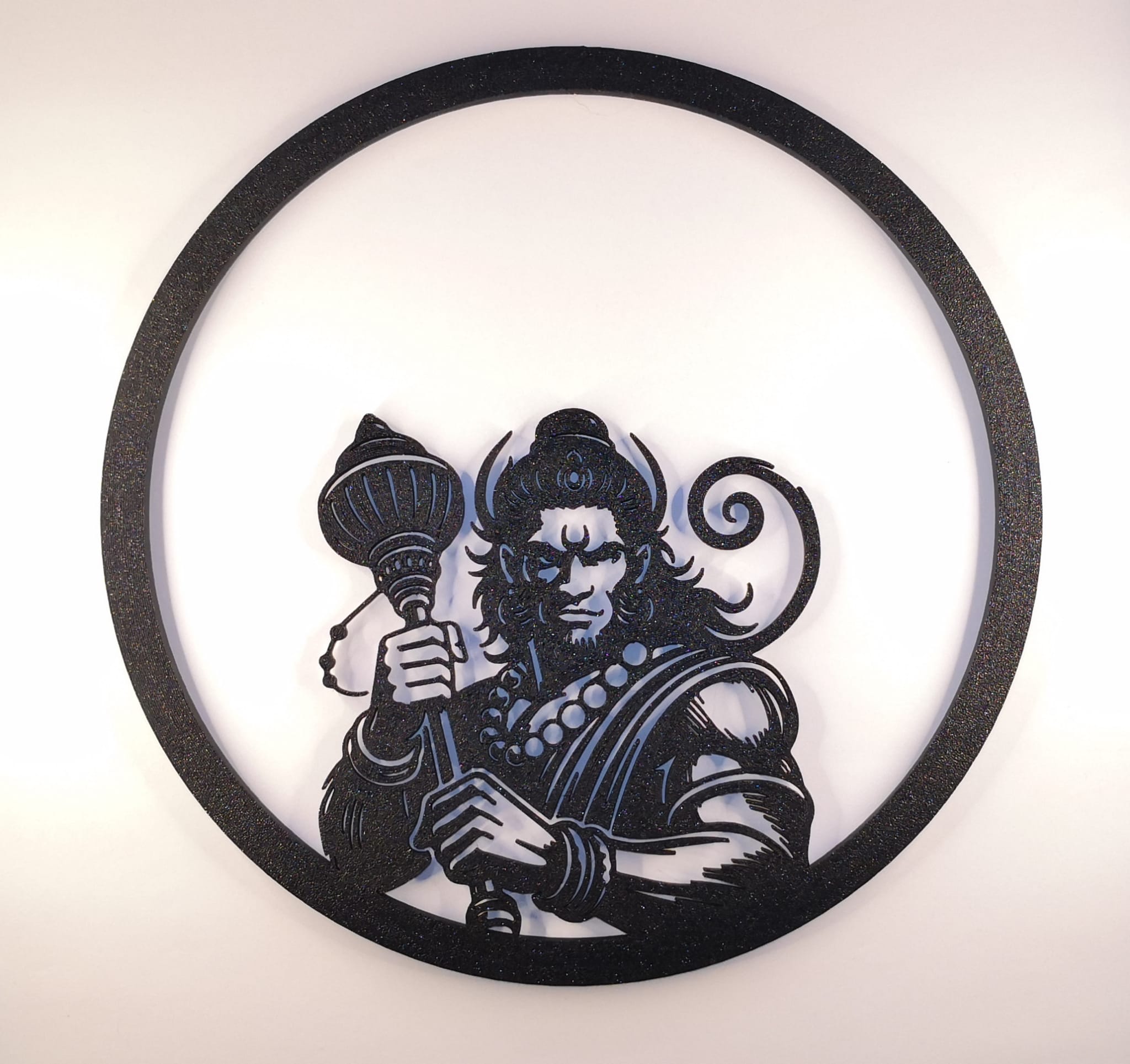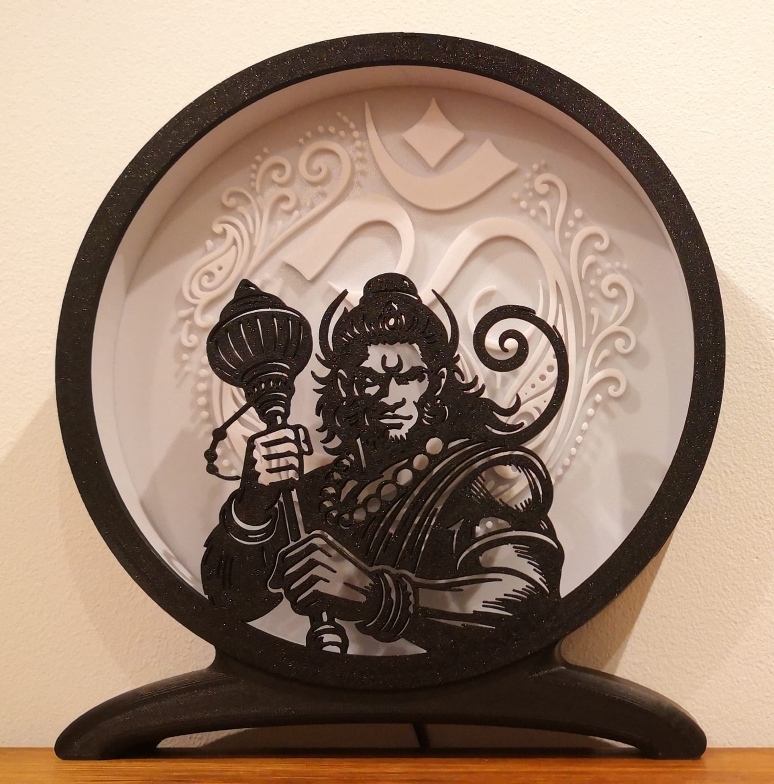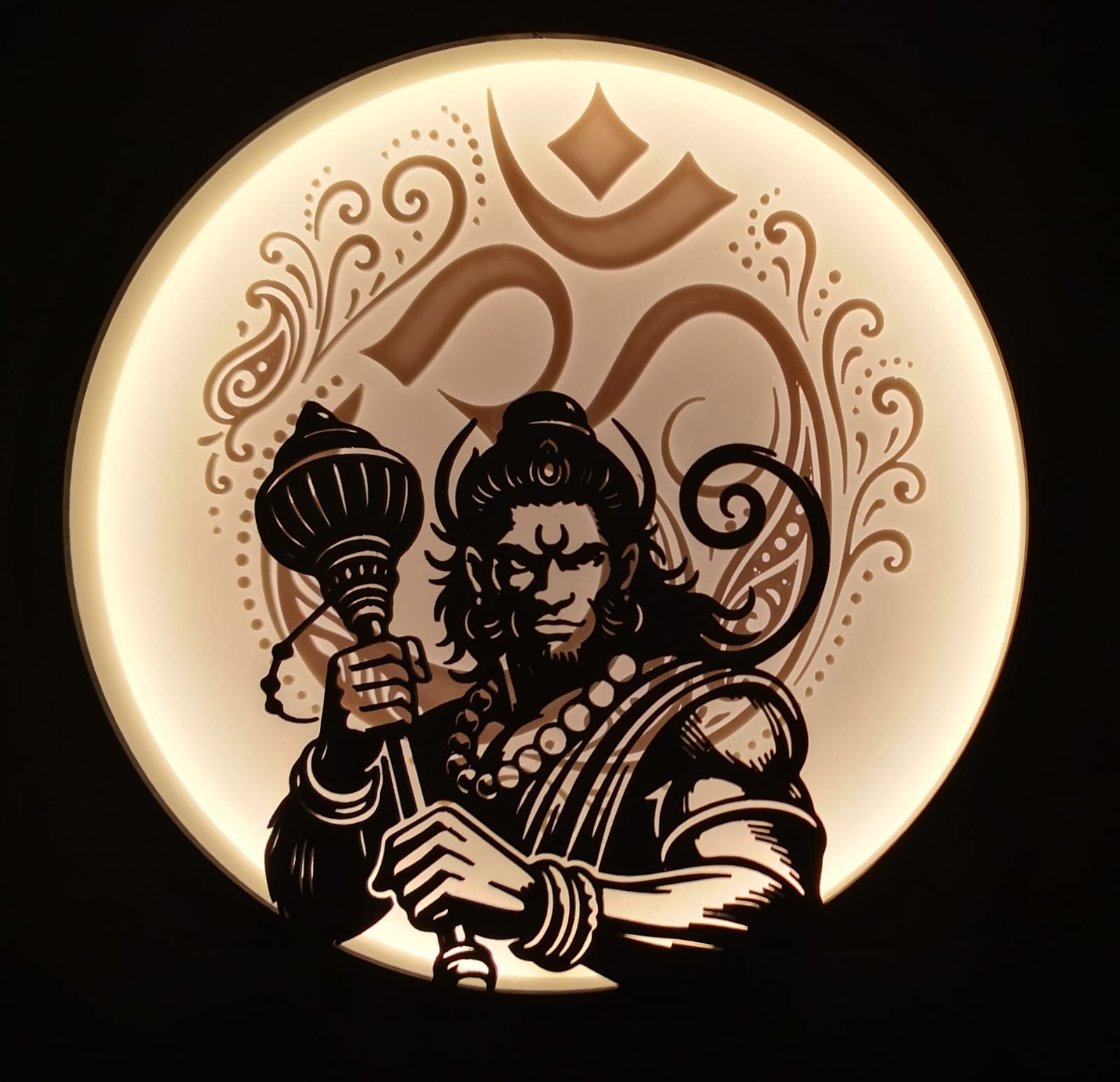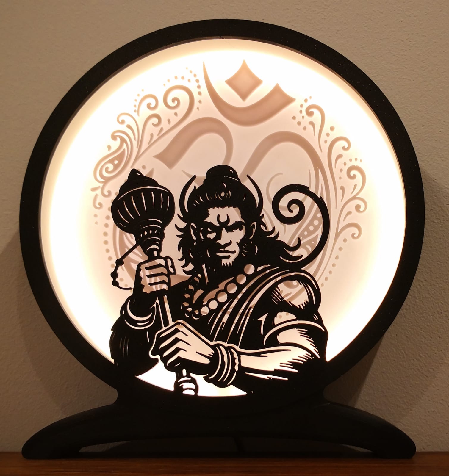 Inspirée de la spiritualité hindoue, cette lampe représente Hanuman tenant sa masse sacrée devant le symbole Om. Elle évoque protection, force et sagesse spirituelle. La lumière douce crée un halo spirituel propice à la méditation et au calme intérieur.