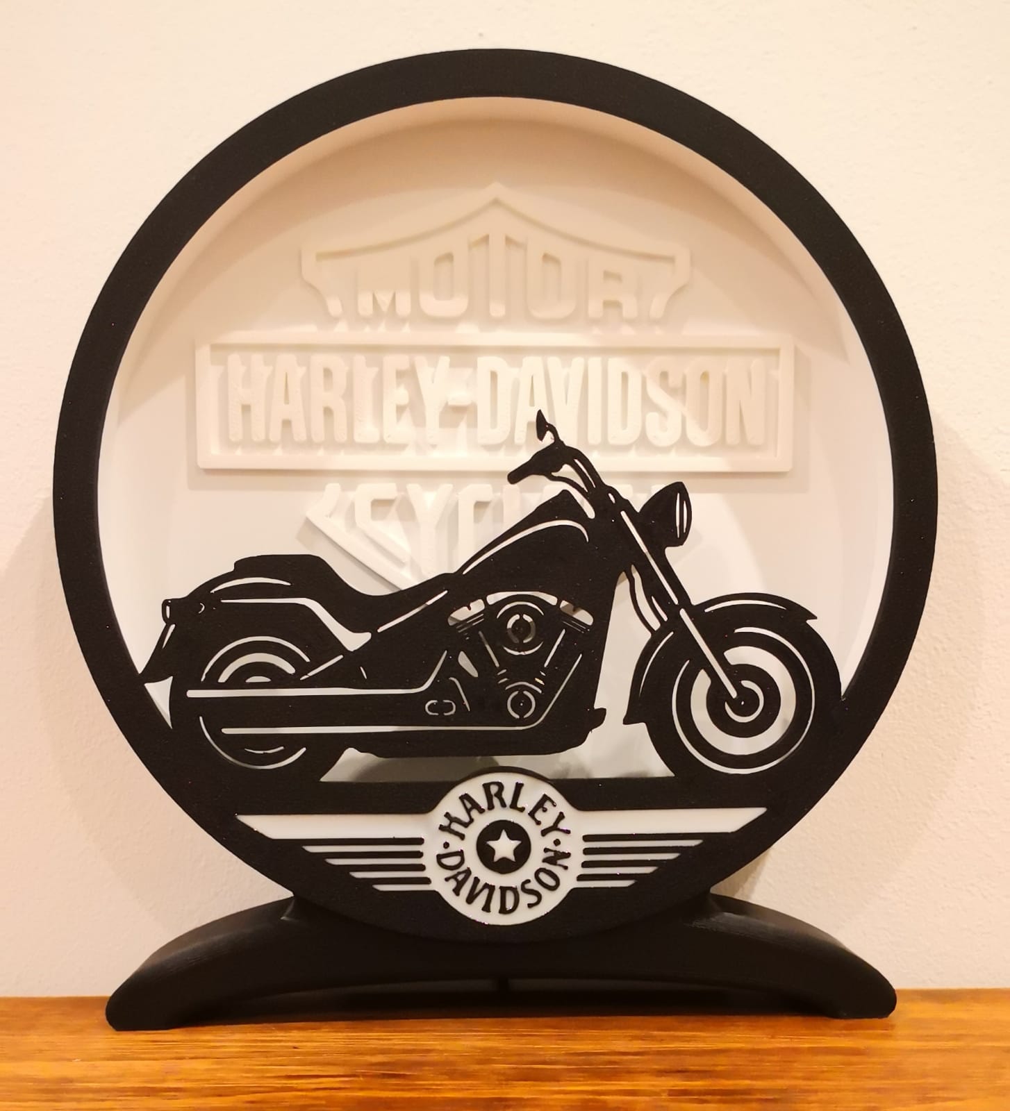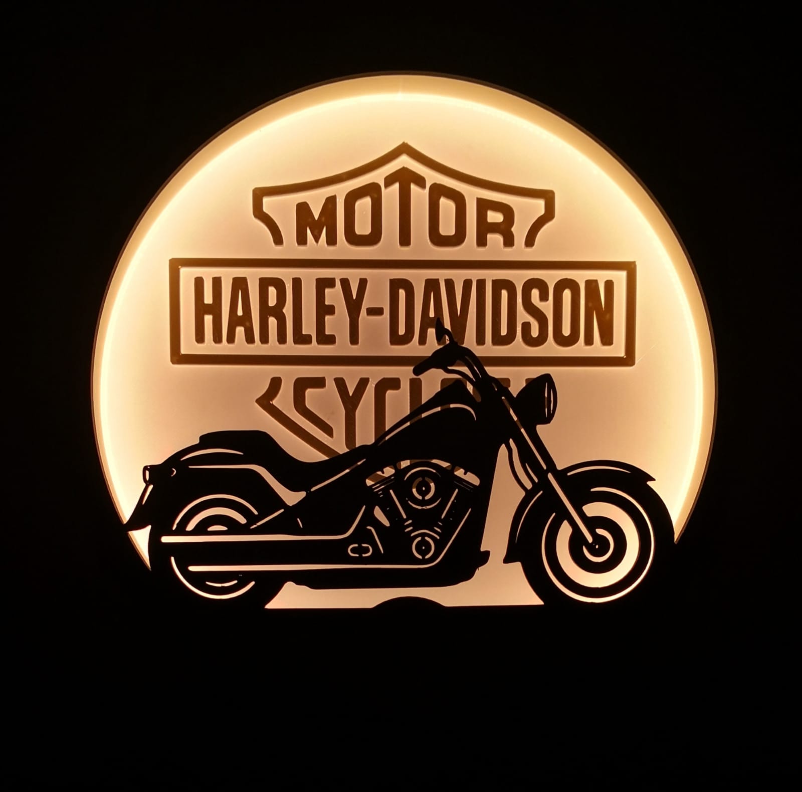 Cette lampe met en avant l’univers emblématique Harley-Davidson, avec une silhouette de moto iconique intégrée dans une composition circulaire élégante. Le célèbre logo en arrière-plan renforce immédiatement l’identité visuelle et l’esprit biker.