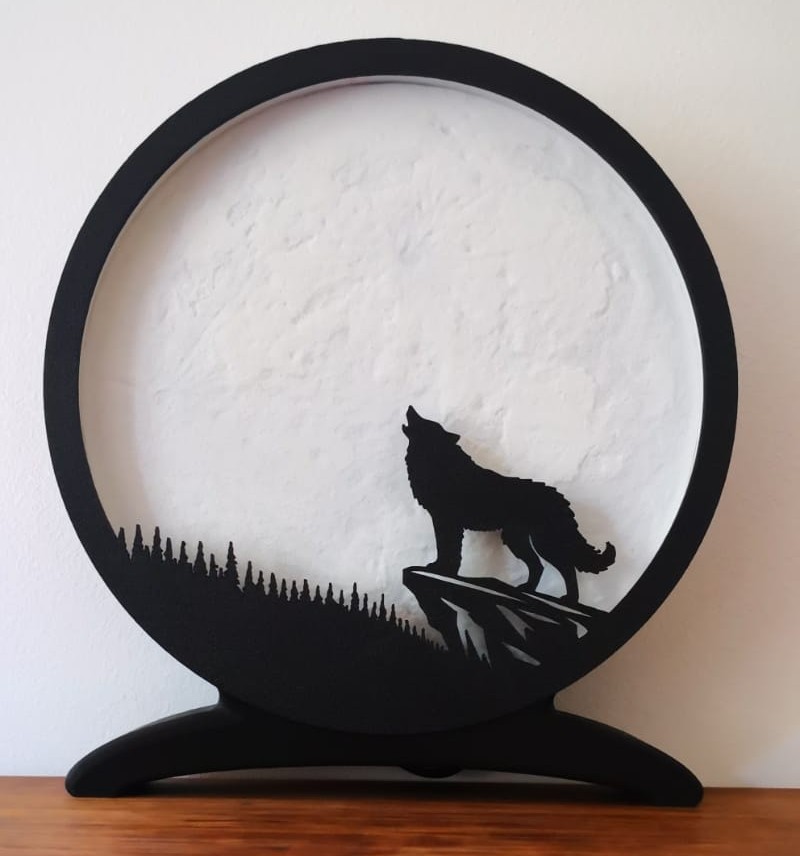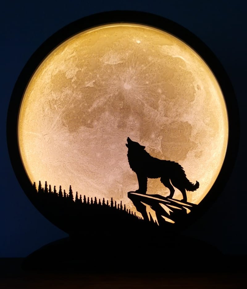 Cette lampe représente un loup solitaire hurlant sous une pleine lune majestueuse. Le contraste entre la silhouette sombre du loup et la texture lumineuse de la lune crée une scène nocturne captivante inspirée de la nature sauvage. Elle apporte une atmosphère mystérieuse et apaisante, idéale pour les amateurs d’animaux, de paysages nocturnes ou de décorations naturelles.