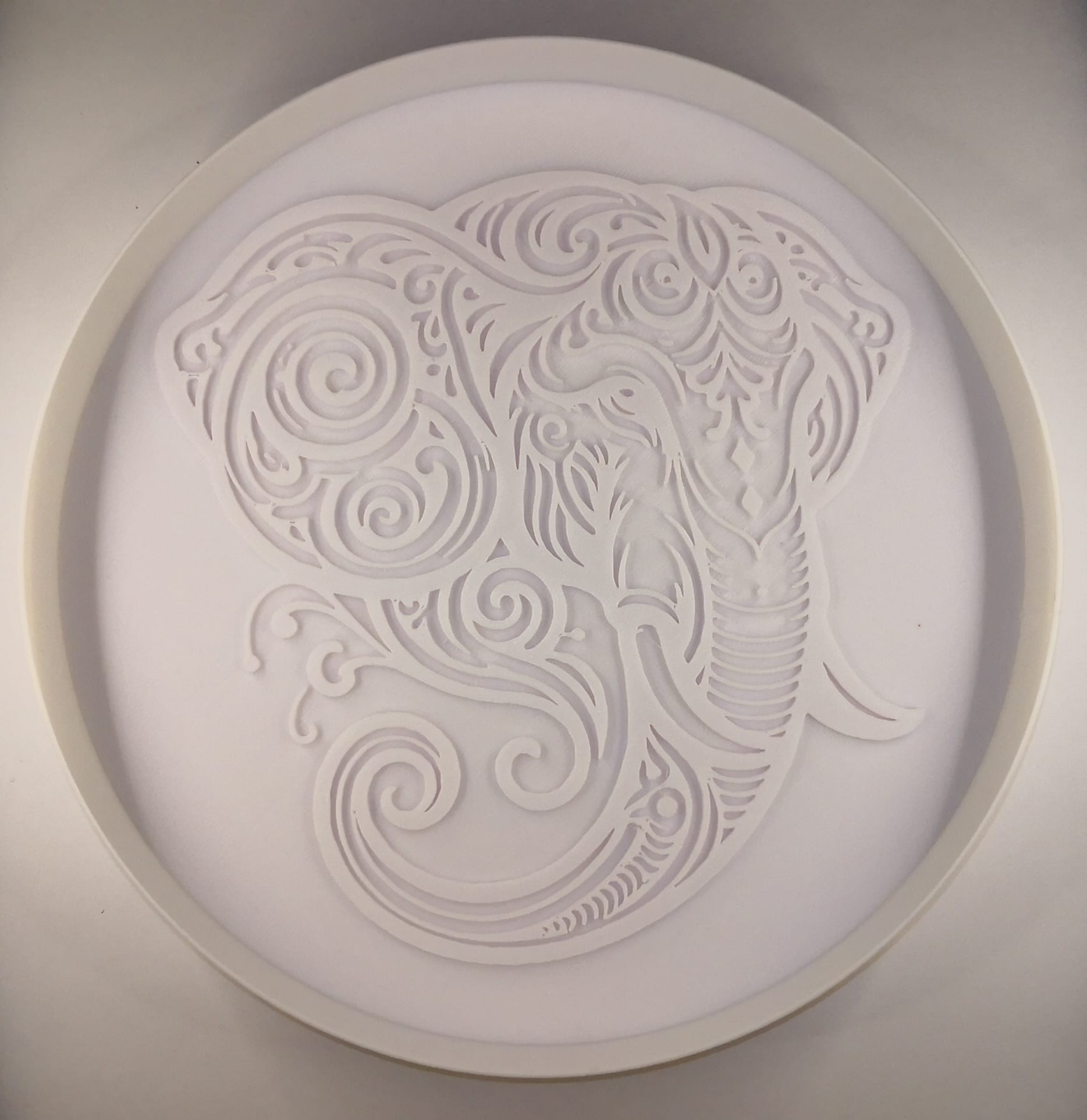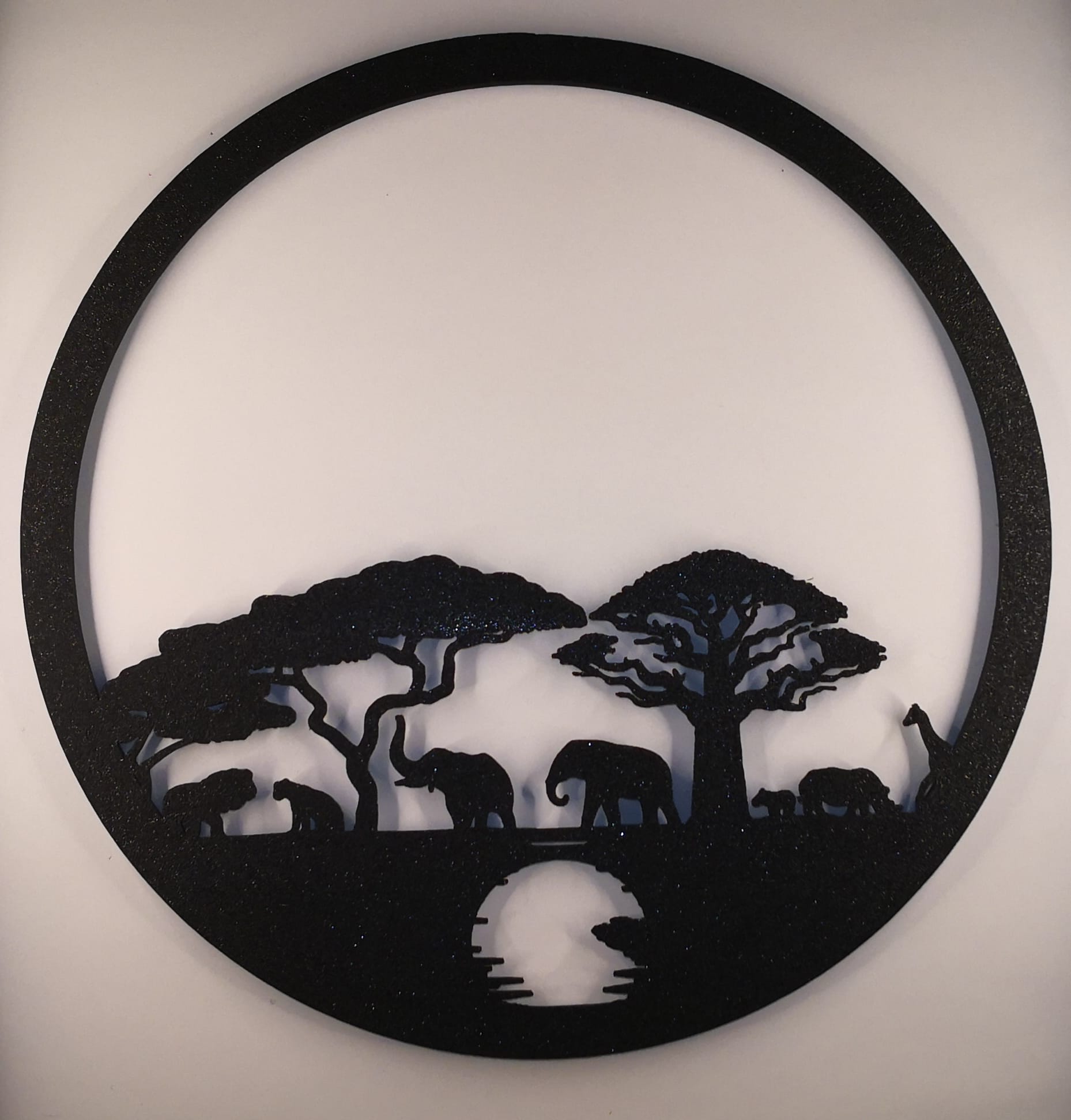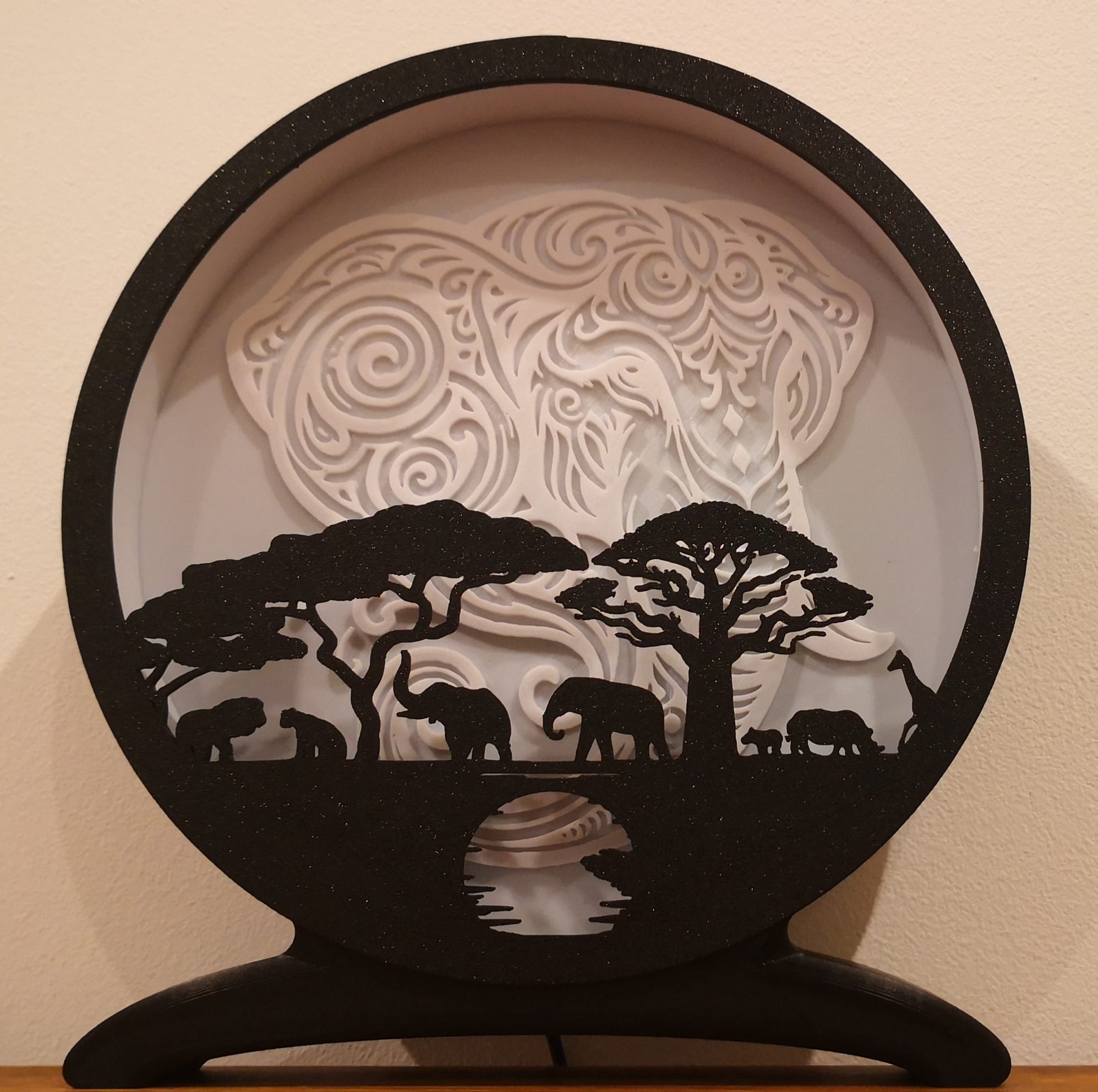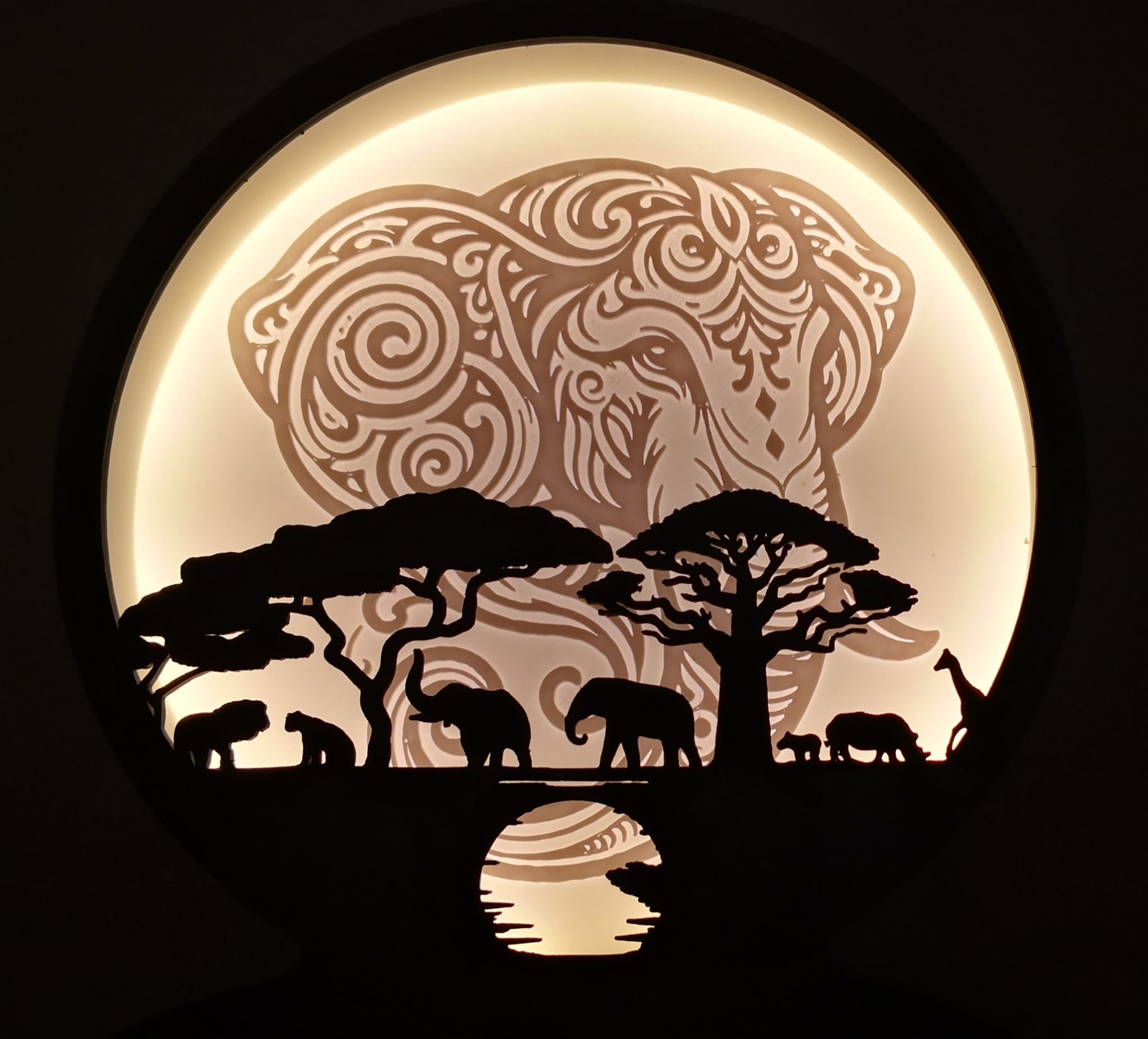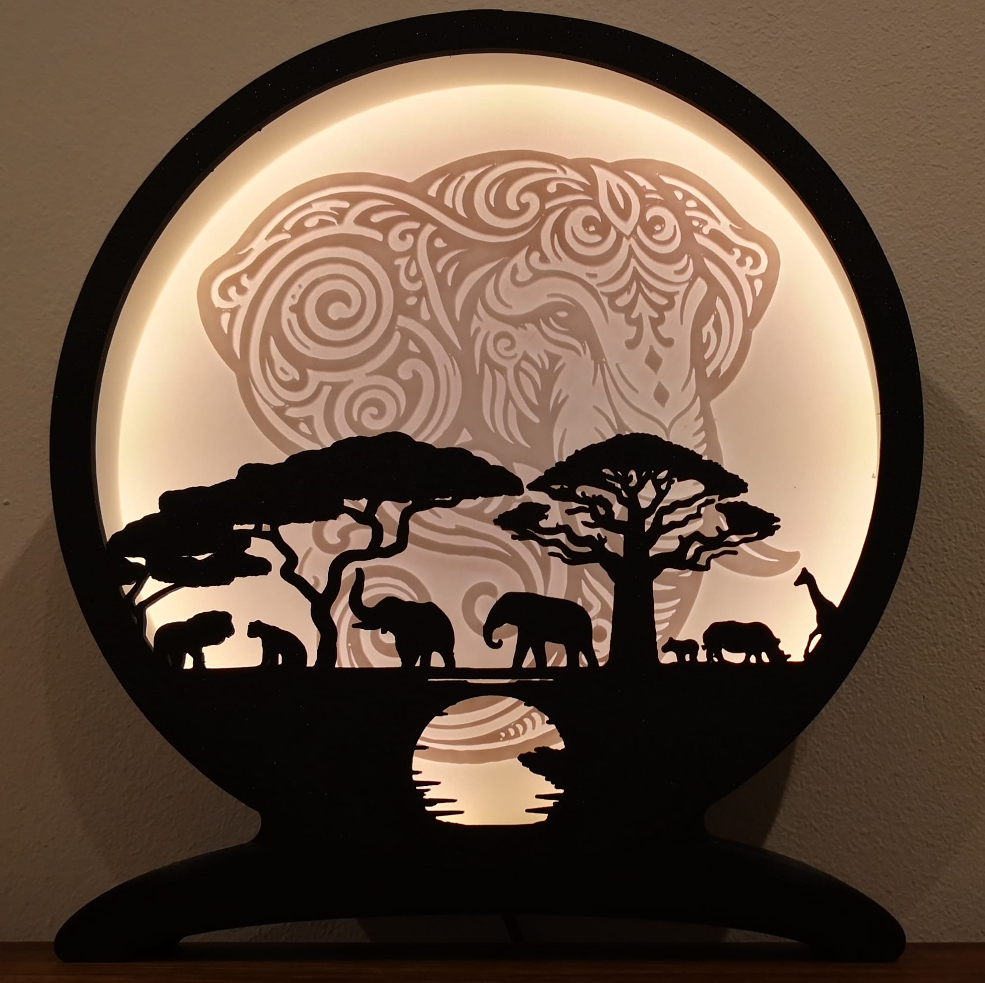Cette lampe met en scène une silhouette inspirée de la savane africaine, avec une famille d’éléphants traversant un paysage naturel composé d’arbres emblématiques. En arrière-plan, un éléphant ornemental aux motifs finement travaillés apporte une dimension artistique unique — une composition visuelle à la fois puissante et apaisante.